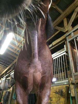 I was also too lazy to get an extension cord so I, um, stood on his lead rope to keep him in one place. DON’T BE LIKE ME, INTERNET. Your caveat here is that I know this horse intimately, he is solid for clipping (he was antsy last night because it was dinnertime) and I did actually position myself so I could duck into an empty area off the aisle if he decided to snark about it.