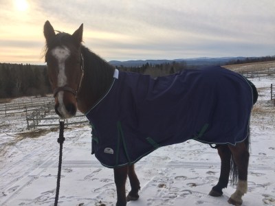 10:07 pm – Finish haying (YES, REALLY), and do blankets. Every horse that had a neck cover got that neck cover that cover pulled up and buckled down. One horse was wearing a cooler from being worked earlier in the evening; I pulled that and put on the two blankets in the aisle. Probably about 1/3 of the horses had some layer that needed to be added. I also took that time to look hard at all the other blanketed horses, and fixed two leg straps that had come undone. Fortunately, I was warmed up enough from haying that I could take my gloves off to do the straps.