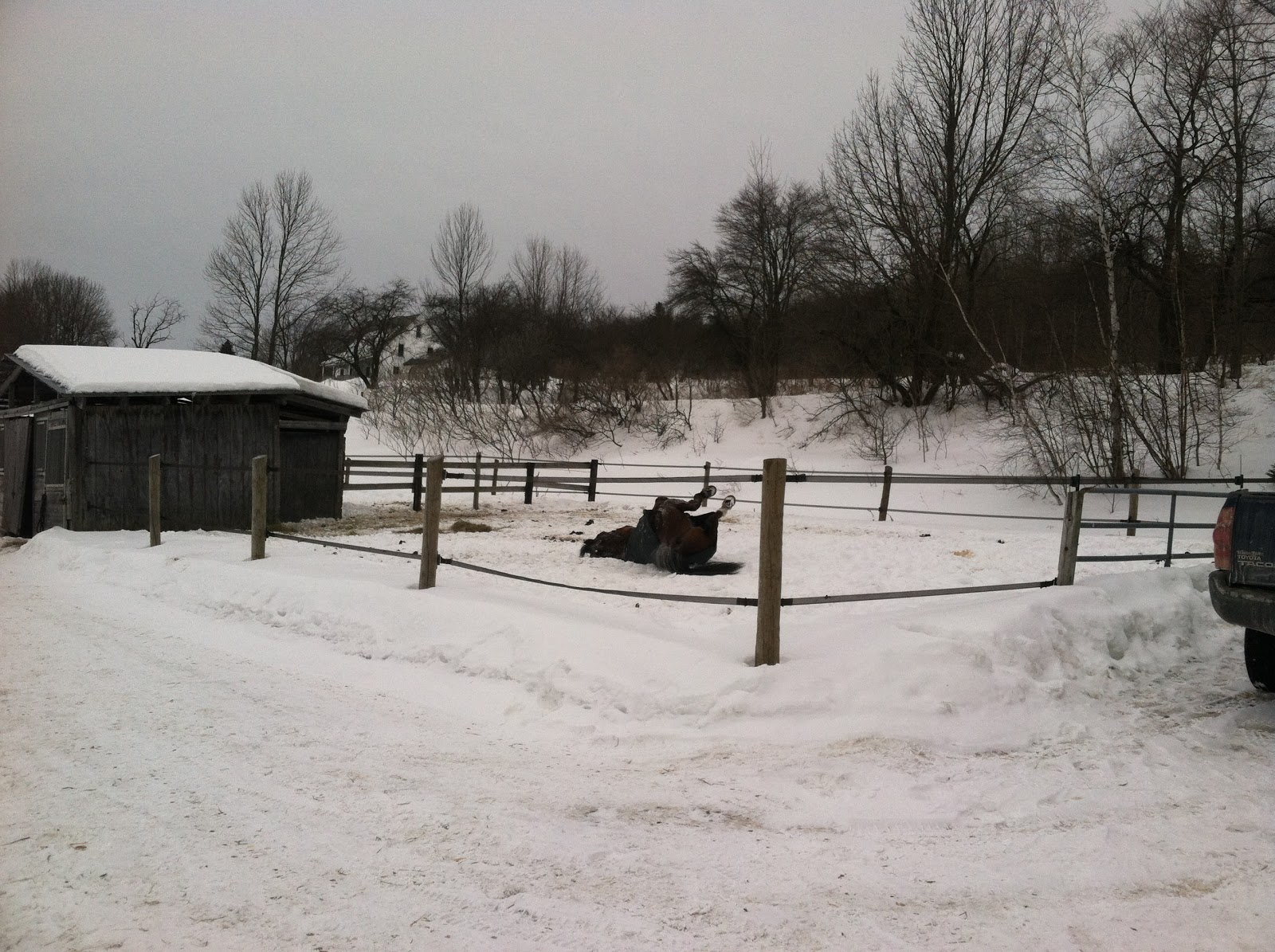 10:07 pm – Finish haying (YES, REALLY), and do blankets. Every horse that had a neck cover got that neck cover that cover pulled up and buckled down. One horse was wearing a cooler from being worked earlier in the evening; I pulled that and put on the two blankets in the aisle. Probably about 1/3 of the horses had some layer that needed to be added. I also took that time to look hard at all the other blanketed horses, and fixed two leg straps that had come undone. Fortunately, I was warmed up enough from haying that I could take my gloves off to do the straps.